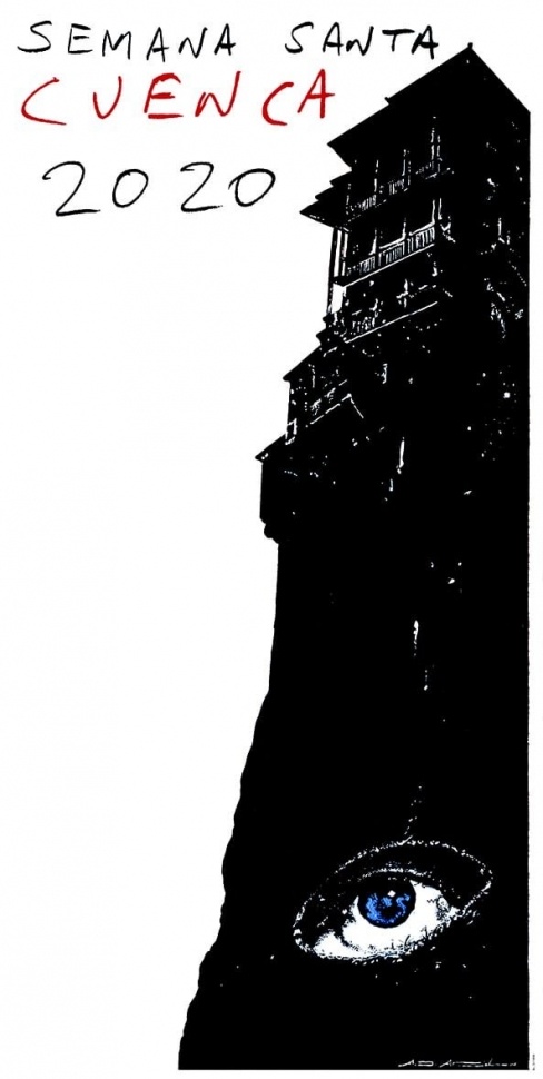 En la obra “las Casas Colgadas se convierten en un imaginario capuz, de color negro neutro, sobre fondo blanco en la edición oficial, para albergar la mirada devocional de un bancero orante que mira y que reza a los Titulares de su Cofradía durante la procesión” detallaba Díaz Arnido. “Esta mirada devocional es, a su vez, la mirada curiosa del forastero que visita la ciudad durante su Semana Santa. Uno de esos forasteros que de un modo u otro se acercan a la Semana Santa de Cuenca es el propio autor del Cartel” reconocía Díaz Arnido. “Así me siento al menos. No en vano el ojo, con la pupila azul representando el cielo de la primavera, es físicamente mi propio ojo, pues considero esta obra algo muy personal, por tratarse de un paso importantísimo en lo artístico y en lo profesional para mí. Llega hasta tal punto mi implicación en lo personal, que el texto ‘Semana Santa Cuenca 2020’, es decir, el mensaje del Cartel, se plasma en él de forma manuscrita, de mi puño y letra”.