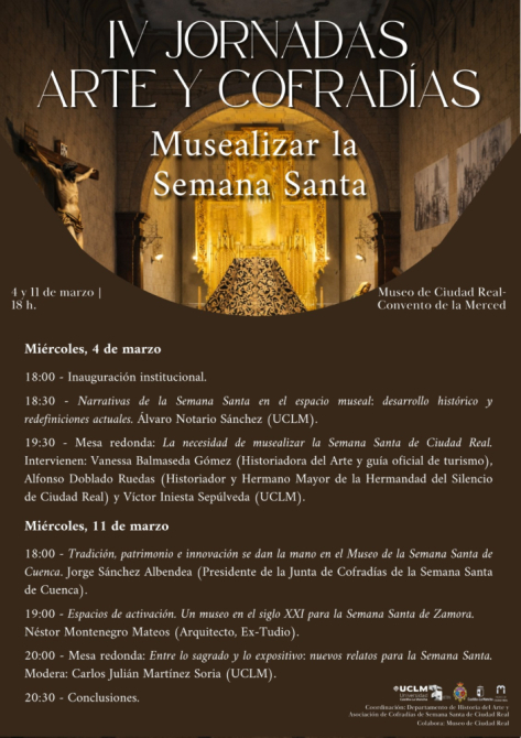 El Museo de Semana Santa de Cuenca estará presente en las IV Jornadas Arte y Cofradías, que se celebran en Ciudad Real los días 4 y 11 de marzo de 2026. La actividad, organizada por la Asociación de Cofradías de Semana Santa de Ciudad Real y el Departamento de Historia del Arte de la UCLM, en colaboración con la Junta de Comunidades y el Museo de Ciudad Real, está centrada este año en la musealización de la Semana Santa.