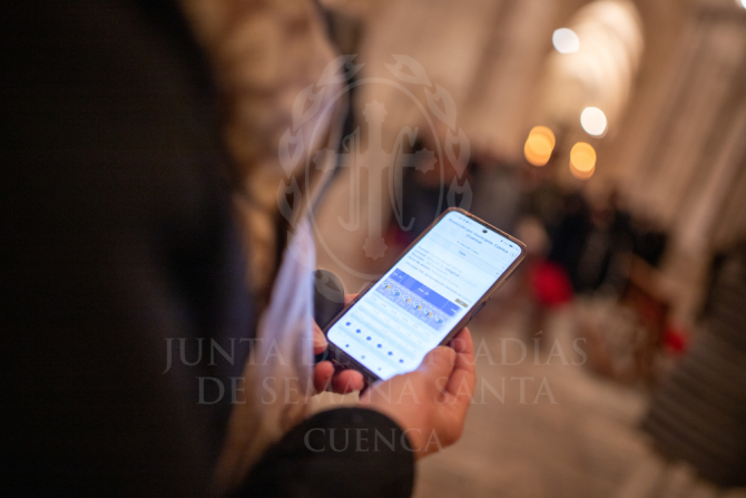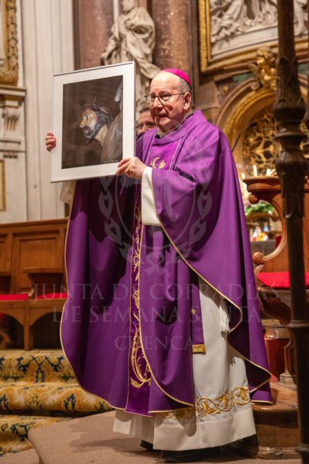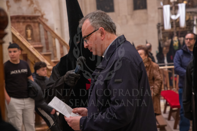 Monseñor José María Yanguas, obispo de la Diócesis de Cuenca, predicó la Primera Palabra (‘Padre, perdónalos, porque no saben lo que hacen’) frente a la Capilla de San Martín, entre las filas de hermanos en silencio. Más cerca que nunca del Stmo. Cristo de la Vera Cruz, ambos frente a frente, en una estampa poco habitual de Lunes Santo, pues generalmente monseñor predica cuando la Vera Cruz ya está en la calle y mira a la multitud congregada en la Plaza Mayor. En este Lunes Santo el escenario fue diferente. Al frente de monseñor, la Cruz. A la izquierda del cortejo, las Sagradas Imágenes de Cristo Yacente y de Ntra. Sra. de la Soledad y de la Cruz.