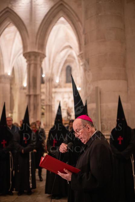 Al concluir el desfile, con la Vera Cruz frente a la Cruz Desnuda, en el lugar habitual de inicio de la procesión, el consiliario de la Hermandad dirigió a los hermanos en el rezo de un padrenuestro y un ave maría. El miserere de Cuenca en las voces del Alonso Lobo puso el punto y final en la Catedral como lo hubiera hecho en San Esteban, de haber sido noche sin lluvia y haber podido salir la procesión.