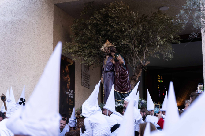 Y en el floral, mención a la tradicional hiedra de La Negación, al camino de flores sobre el que procesionó el Judas (con predominancia de blancos y violetas, intercalados con verdes de corte en tonos ásperos como los de las hojas de olivo) y al exorno en blancos y protagonizado por rosas que lucieron las andas de la Amargura con su tradicional sobriedad y buen gusto. Por cierto que a esta cronista le parecieron este año especialmente bonitos los tres olivos, montados además de modo que llevaban mucho movimiento y que aguantaron bien pese al viento que sopló a tramos, sobre todo en la Plaza.