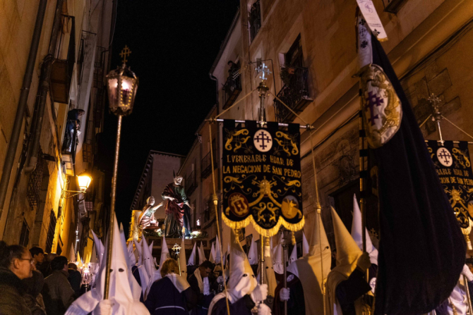 La Amargura y San Juan se despedían a paso mecido de La Negación, sonando Mi Amargura, también a hombro y meciendo, hacia las 02:35 horas, con el Ecce-Homo ya en Aguirre y tras sus pasos la Banda de Mota del Cuervo. Tras vivir idéntico momento con San Pedro hacia las 02:45 horas y sonando Caridad del Guadalquivir, el cortejo ya compuesto únicamente por el Ecce-Homo, la Amargura y las dos bandas (Mota y San Clemente) enfiló hacia la Puerta de Valencia, que alcanzó el Ecce-Homo pasadas las 3 de la madrugada. Todo el camino entre Las Torres y San Andrés fue solitario en las aceras, pero no en las filas, pues muchos fueron los hermanos (incluso niños) que aguantaron con ambas hermandades hasta su final. Porque de eso va también la Semana Santa de Cuenca: de la fe que hace que no desfallezcan las fuerzas, de acompañar hasta donde podemos. Y a veces, quieren el Señor y la Santísima Virgen que podamos hasta el final.