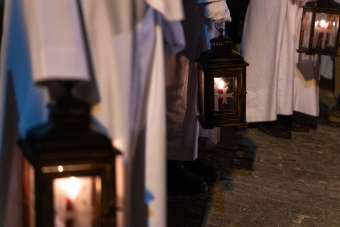 Ser uno con los que visten hoy túnica y capuz, pero también con quienes lo visten ya en la procesión de la eternidad. Es lo que simbolizaban las dos rosas rojas por los difuntos que llevó durante todo el desfile sobre las andas la Santa Cena: una de ellas muy especial, pues fue para el hermano de Francisco Dolz, bancero que debería haber sido de la Cena este año y que lo fue, de la Cena eterna y desde lo alto con Nuestro Señor, acompañando en espíritu a su hermano que sí ha sacado, por los dos, el paso; por él lucieron crespón los banceros del cenáculo y también, el Guion.
